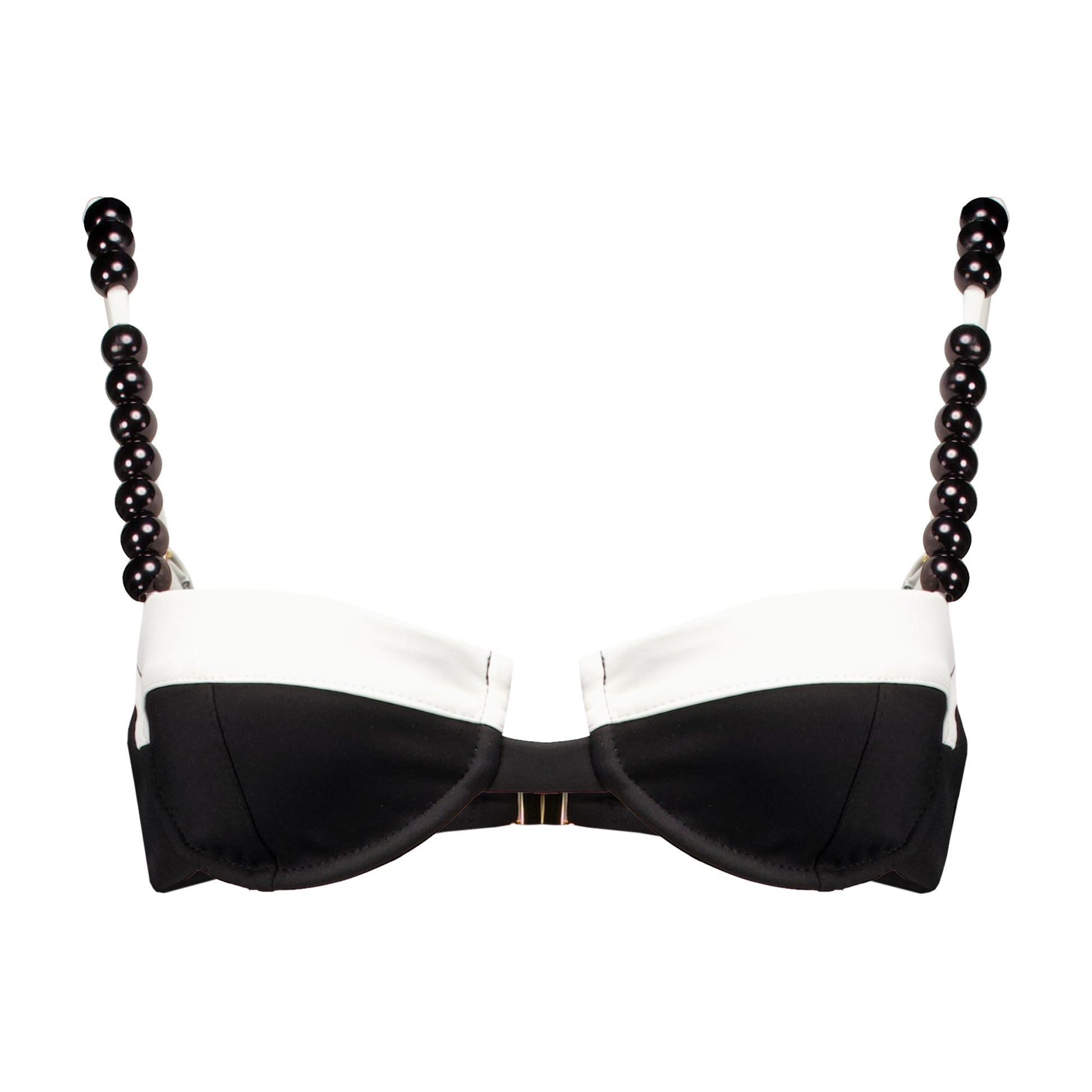Elevate your swimwear style with our chic two tone bikini top, meticulously adorned with black beads for a hint of glamour. This elegant piece features adjustable straps, ensuring a perfect and comfortable fit while adding a touch of sophistication.