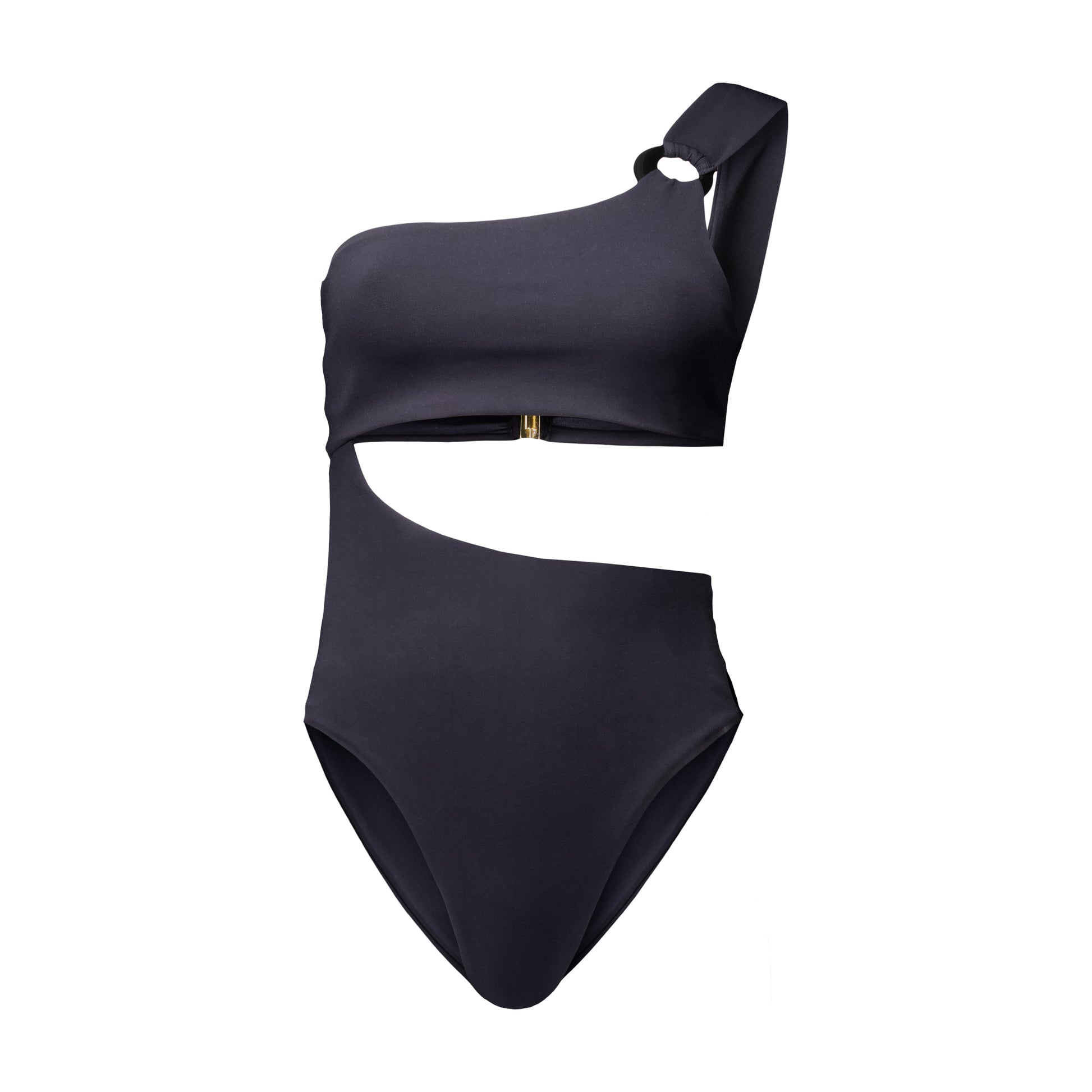 Elegant asymmetrical one piece swimsuit. Cutout at waist. Acrylic hoop at the strap. Gold hardware closure in the back. Soft cups.