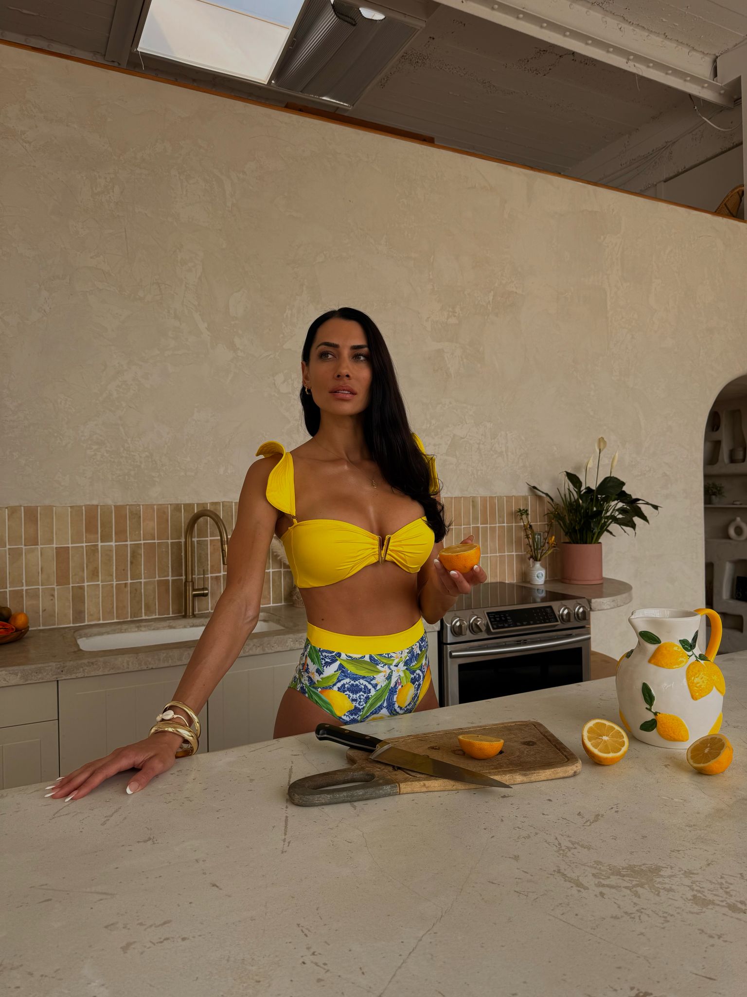 Meet the Lemon Drop bikini top—a chic blend of style and versatility. Featuring luxe textured fabric and removable straps, it offers a customizable fit for every vibe. The gold V-shaped hardware steals the spotlight, infusing a touch of elegance and sophistication. Perfect for mixing, matching, and making a statement.