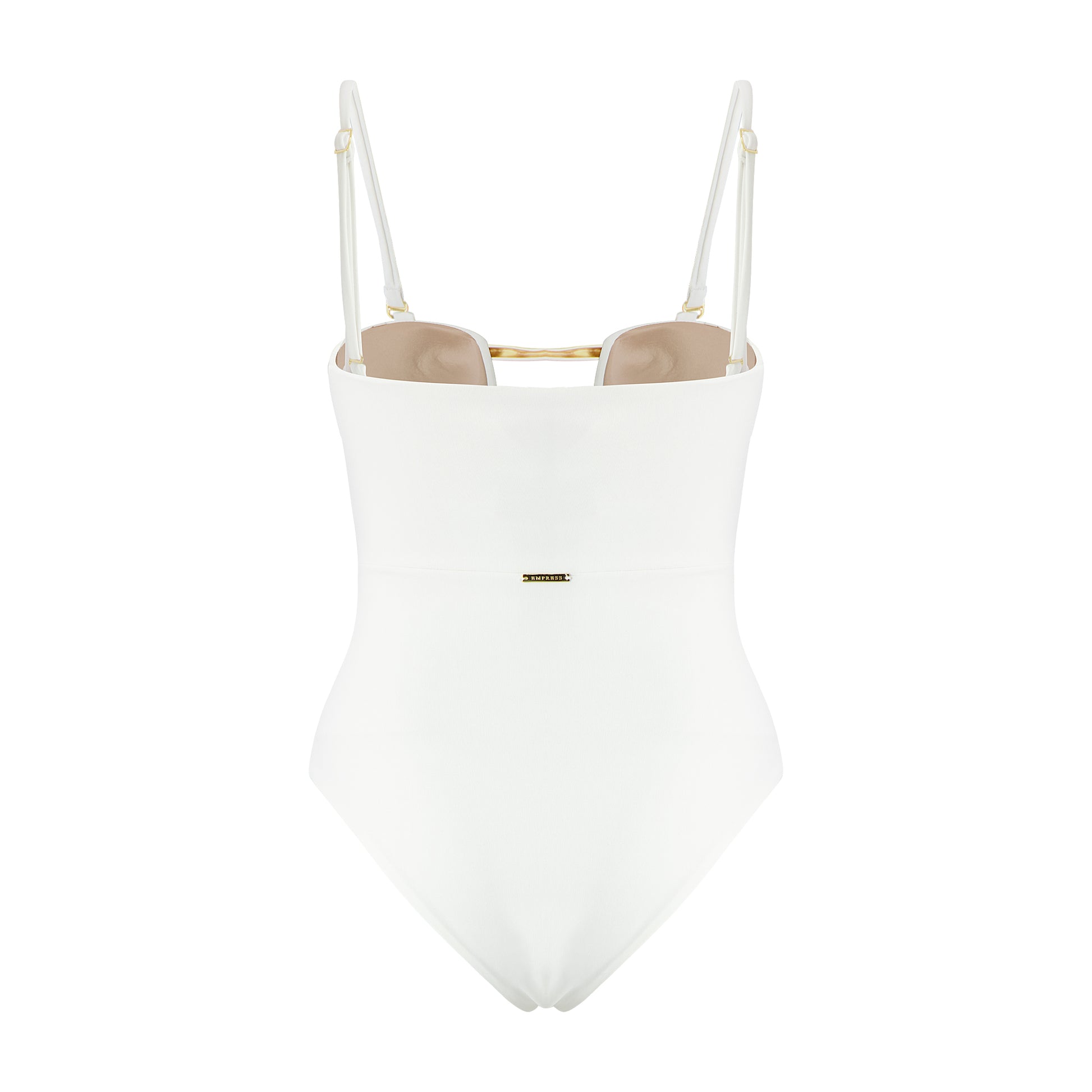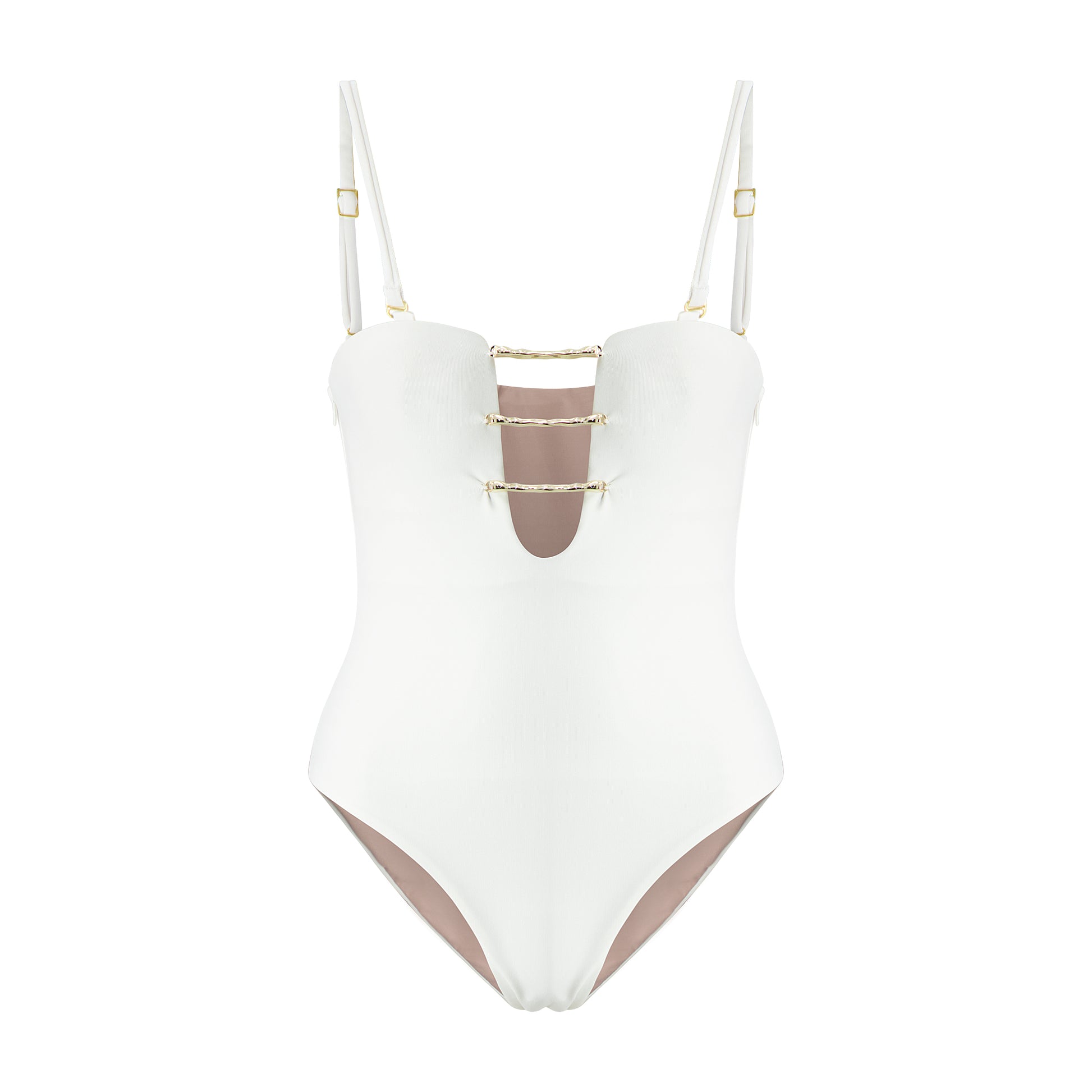 Turn heads in the Luxe Bossa white one-piece, a vision of sophistication and elegance. This stunning white swimsuit is crafted from premium, ultra-soft fabric that feels as luxurious as it looks. Its minimalist design is elevated with gleaming gold-dipped hardware accents, adding a touch of opulence to the timeless silhouette.